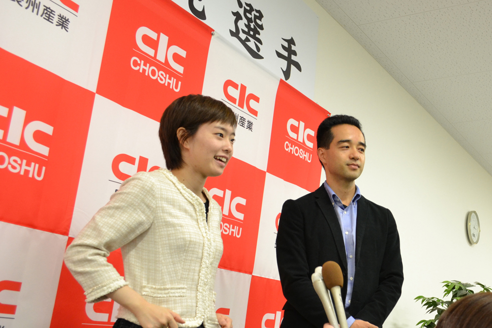 石川 佳純選手と長州産業株式会社 取締役社長 岡本 晋